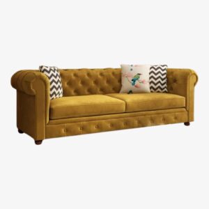 Product Features:Â Henry 3-Seater Sofa is the perfect amalgamation of elegance and comfort. The panel rolled arms, and tufted backrest of this fabric sofa, will infuse regal style in your interior while maximizing the seating comfort. The base frame of this fabric sofa is crafted from pure Sheesham wood that guarantees its long-lasting durability.